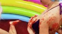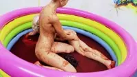 The scene begins with the blonde and brunette lesbian temptresses meeting by an inflatable pool, their eyes sparkling with desire for one another.Both women are fully dressed in alluring lingerie that accentuates their feminine curves, with the blonde sporting a lacy blue bra set and the brunette donning a red satin corset and garters.As they embrace each other underwater, the inflatable pool becomes an ideal setting for their passion.The seductive scene begins as the lesbians submerge themselves in the water, and the blonde presses her lips against the brunettes as their fingers trace enticingly along the contours of their bodies.As they break the surface for air, the brunette gasps, I want you so much.The blonde smiles and nods before diving back underwater.In a flurry of sensual activity, the two women engage in a passionate kissing session, their bodies pressing tightly against one another.They tease each other by rubbing their hands over the sensitive spots on their bodies nipples, clitorises, and labia.The blonde starts to lick the juicy and wet brunette in a deepthroat way, making the brunettes body shiver with happiness.The womens moans grow louder as they pleasure each other in the red bath water filled with juices.The brunette begins to finger herself while watching her girlfriend.Their breathing becomes heavy and quick, and their eyes lock onto each other with intense passion.The blonde continues licking the brunette, making her clit spread wide open and become more sensitive with every touch.As their excitement grows, the two women move closer and embrace passionately on the edge of the pool.They engage in a deepthroat 69 position, taking turns in satisfying each other completely.The blonde licks and sucks hungrily at the brunettes clit while the brunette plays with her girlfriends dripping pussy.The women reach a climax together as they kiss, sharing their passion in an electrifying moment that leaves them both breathless and fulfilled.The water turns even redder from their orgasms mixed with the bath juices.Afterwards, they share an embrace full of love and satisfaction, making the water ripple around them.In this erotic underwater encounter between these two girlfriends, the focus is on the pleasure they derive from each others bodies in a wet and sensual play.Their bodies are clothed in seductive lingerie as they engage in passionate kisses and caresses that lead to an explosive climax.This scene perfectly demonstrates the intensity of their love, wrapped up in the joy of shared pleasure.